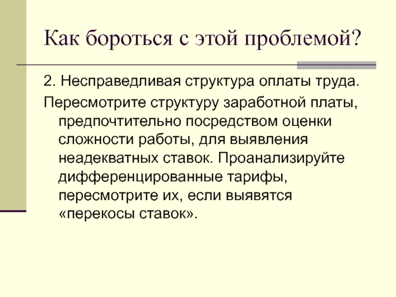 структуру заработной платы, предпочтительно посредством оценки сложности работы, для выявления неадекватных ставок. Проанализируйте дифференцированные тарифы, пересмотрите их, если выявятся «перекосы ставок».