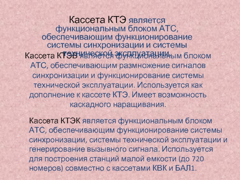 Слайд 14Кассета КТЭВ является функциональным блоком АТС, обеспечивающим размножение сигналов синхронизации и