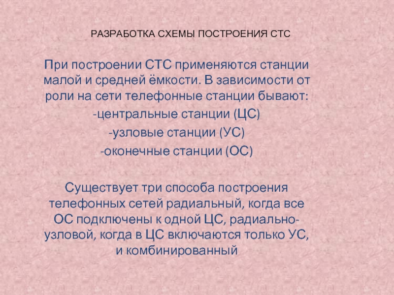 Существует три способа построения телефонных сетей радиальный, когда все ОС подключены к одной ЦС, радиально-узловой, когда в ЦС включаются только УС, и комбинированный