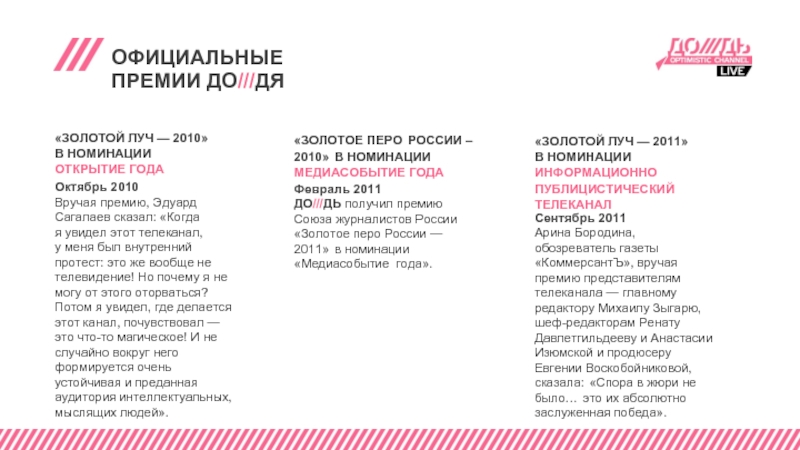 В конкурсе ТЭФИ 2011 ДОЖДЬ получил специальный приз «Прорыв года».