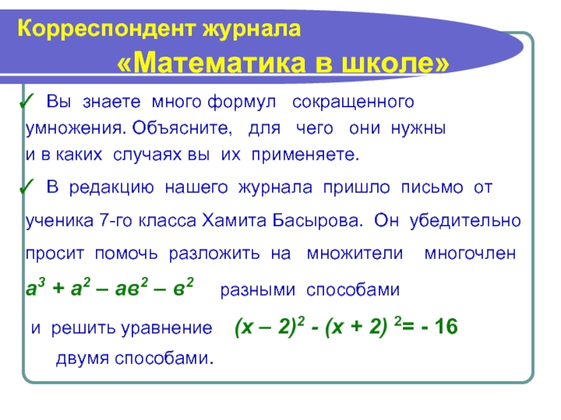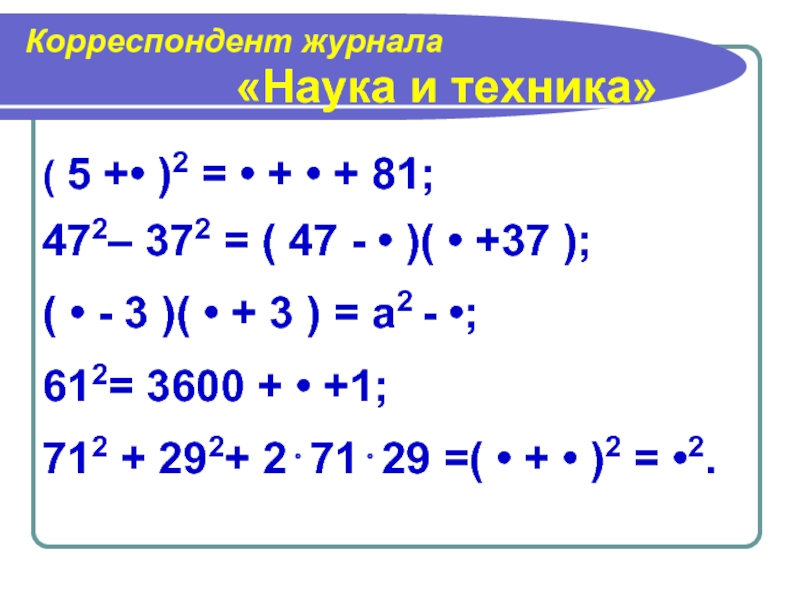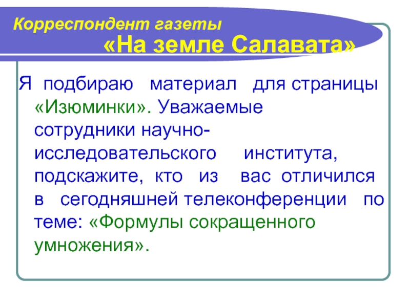 Я подбираю материал для страницы «Изюминки». Уважаемые сотрудники научно-исследовательского института, подскажите, кто из вас отличился в сегодняшней телеконференции по теме: «Формулы сокращенного умножения».