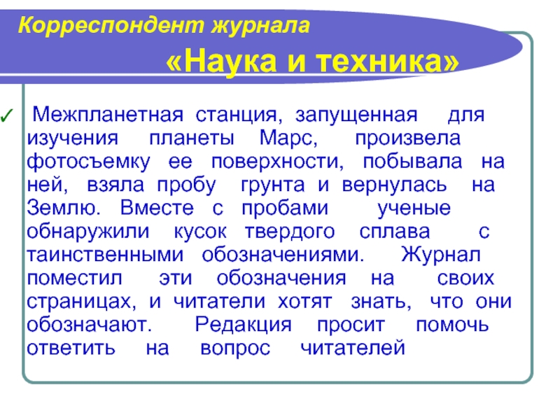 Межпланетная станция, запущенная для изучения планеты Марс, произвела фотосъемку ее поверхности, побывала на ней, взяла пробу грунта и вернулась на Землю. Вместе с пробами ученые обнаружили кусок твердого сплава с таинственными обозначениями. Журнал поместил эти обозначения на своих страницах, и читатели хотят знать, что они обозначают. Редакция просит помочь ответить на вопрос читателей