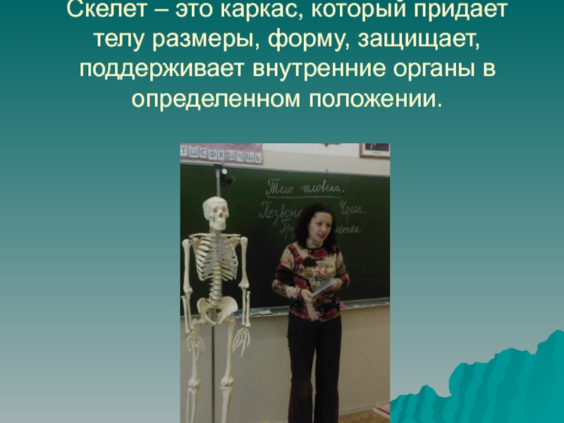 Слайд 3Скелет – это каркас, который придает телу размеры, форму, защищает, поддерживает