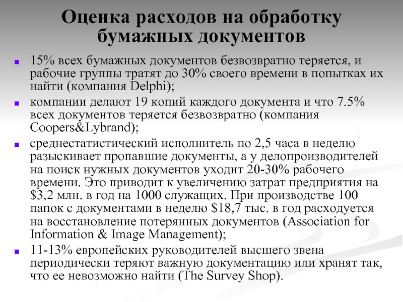 компании делают 19 копий каждого документа и что 7.5% всех документов теряется безвозвратно (компания Сoopers&Lybrand);