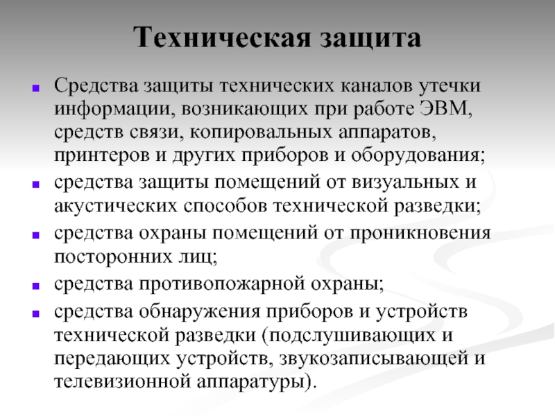 средства обнаружения приборов и устройств технической разведки (подслушивающих и передающих устройств, звукозаписывающей и телевизионной аппаратуры).