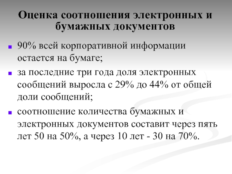соотношение количества бумажных и электронных документов составит через пять лет 50 на 50%, а через 10 лет - 30 на 70%.