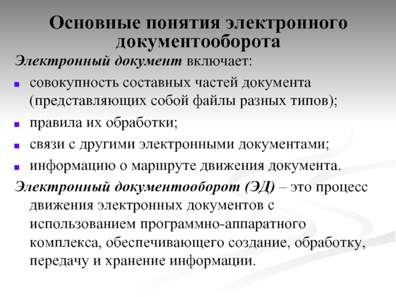 Электронный документооборот (ЭД) – это процесс движения электронных документов с использованием программно-аппаратного комплекса, обеспечивающего создание, обработку, передачу и хранение информации.