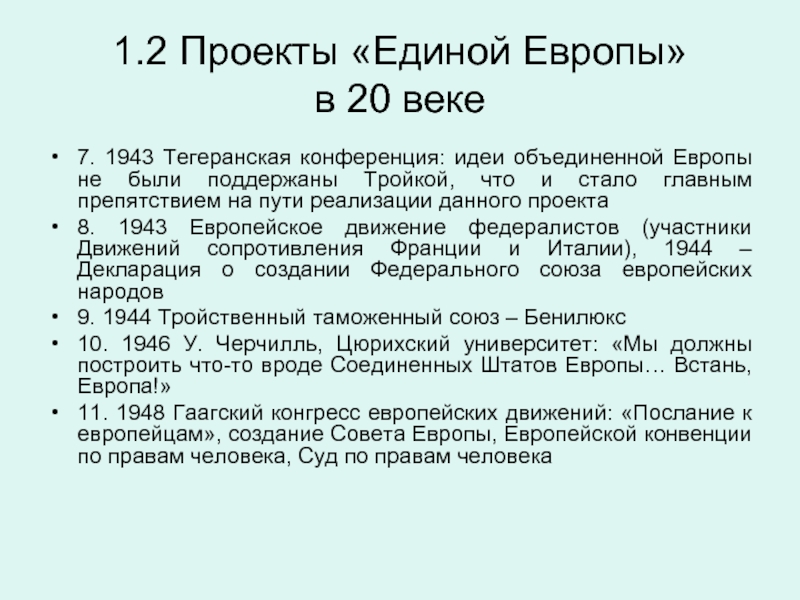 8. 1943 Европейское движение федералистов (участники Движений сопротивления Франции и Италии), 1944 – Декларация о создании Федерального союза европейских народов