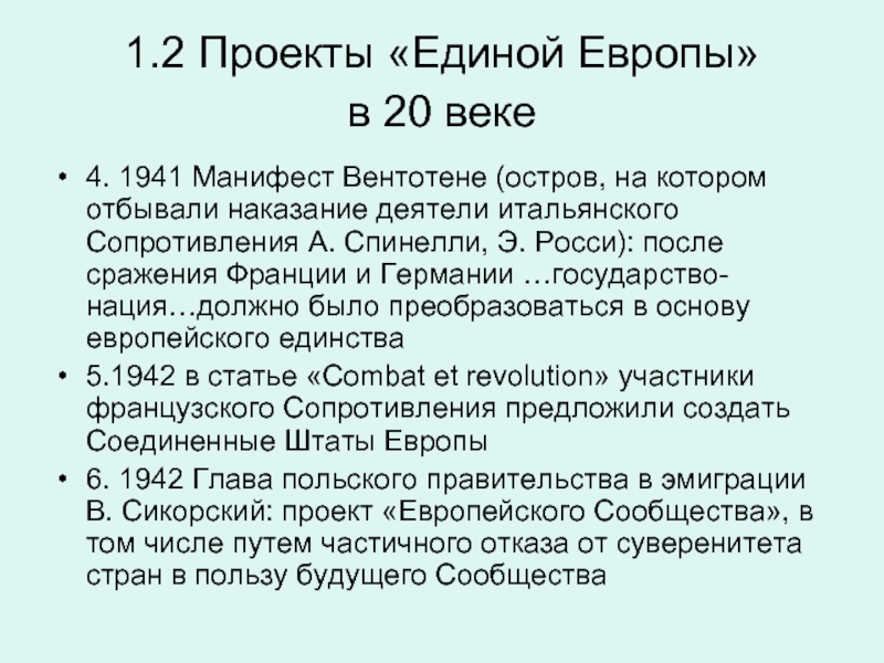 6. 1942 Глава польского правительства в эмиграции В. Сикорский: проект «Европейского Сообщества», в том числе путем частичного отказа от суверенитета стран в пользу будущего Сообщества