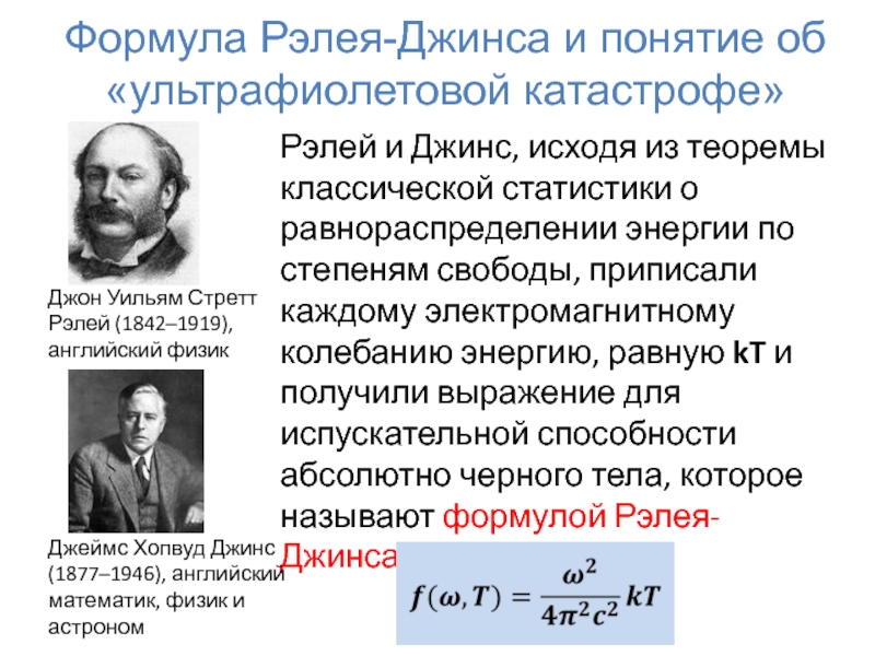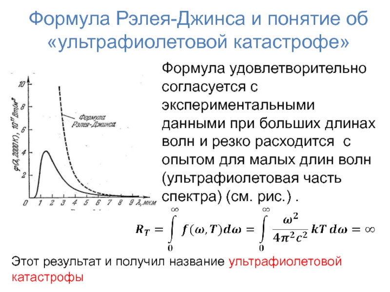 Формула удовлетворительно согласуется с экспериментальными данными при больших длинах волн и резко расходится с опытом для малых длин волн (ультрафиолетовая часть спектра) (см. рис.) .