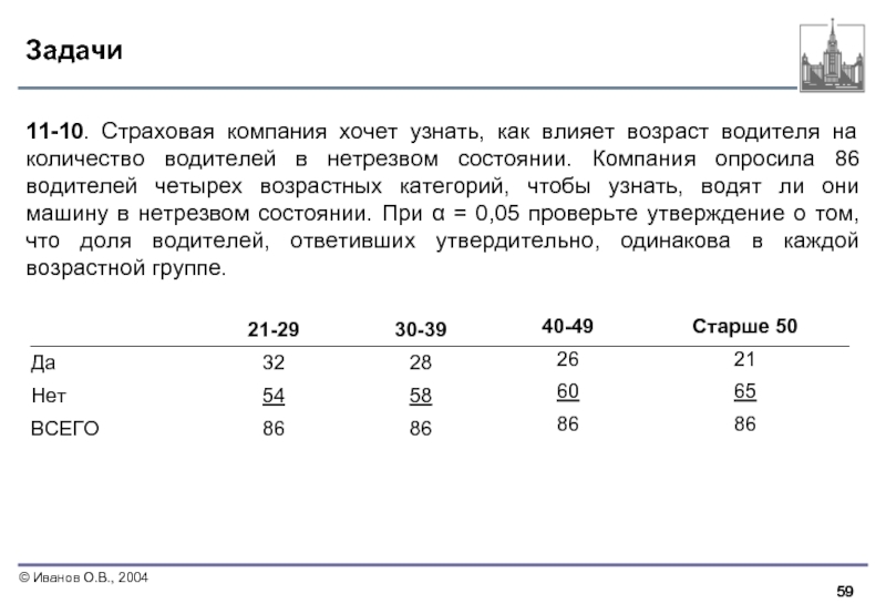 водителей в нетрезвом состоянии. Компания опросила 86 водителей четырех возрастных категорий, чтобы узнать, водят ли они машину в нетрезвом состоянии. При α = 0,05 проверьте утверждение о том, что доля водителей, ответивших утвердительно, одинакова в каждой возрастной группе.