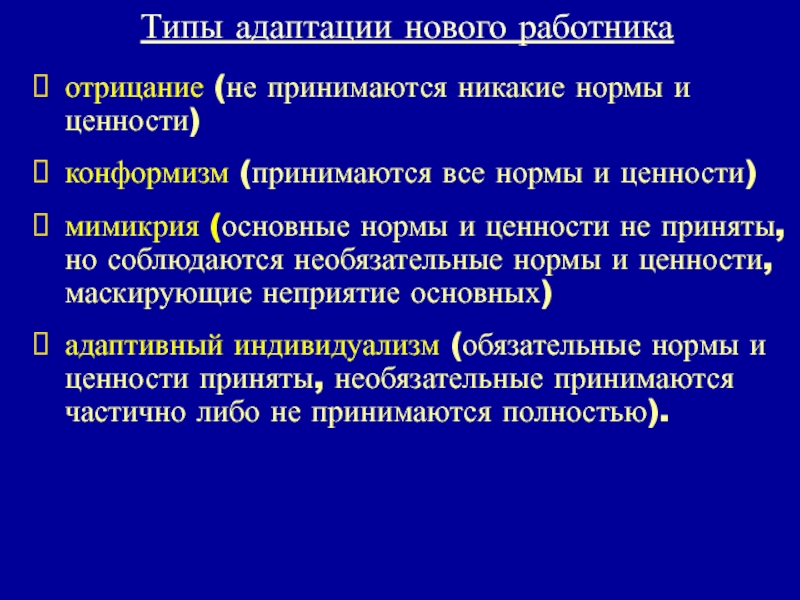 адаптивный индивидуализм (обязательные нормы и ценности приняты, необязательные принимаются частично либо не принимаются полностью).