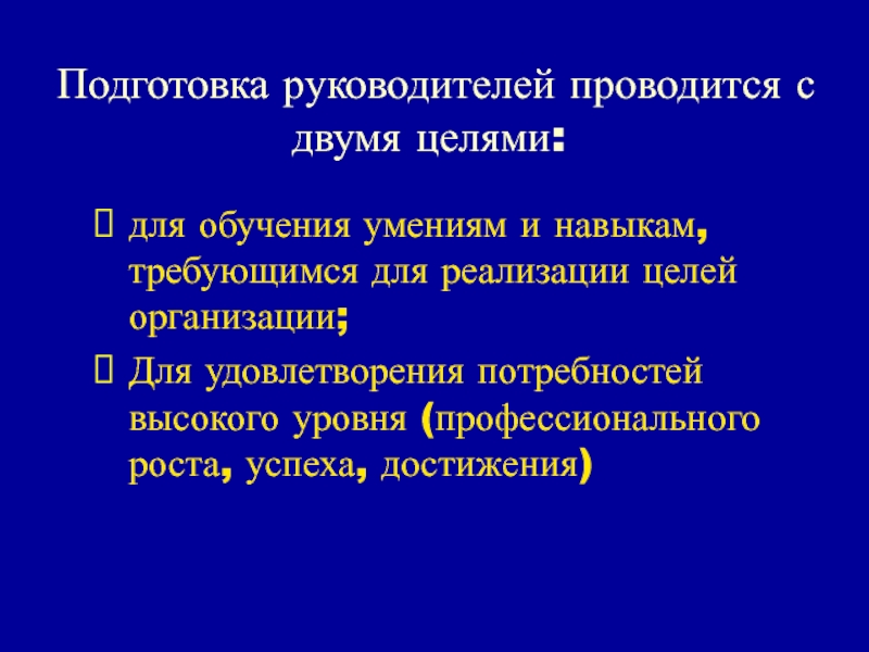 Слайд 36Подготовка руководителей проводится с двумя целями: