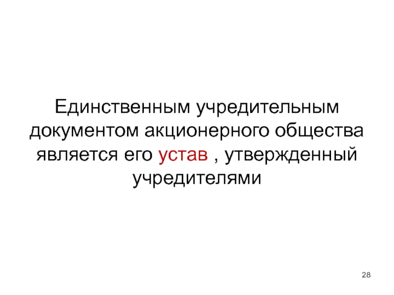 Слайд 28Единственным учредительным документом акционерного общества является его устав , утвержденный учредителями