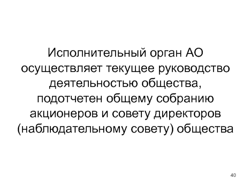 Слайд 40Исполнительный орган АО осуществляет текущее руководство деятельностью общества, подотчетен общему собранию