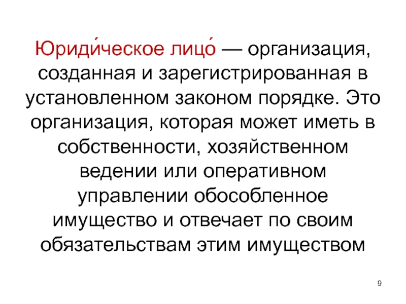 Слайд 9Юриди́ческое лицо́ — организация, созданная и зарегистрированная в установленном законом порядке.