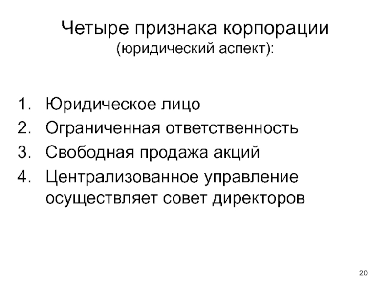 Слайд 20Четыре признака корпорации (юридический аспект):