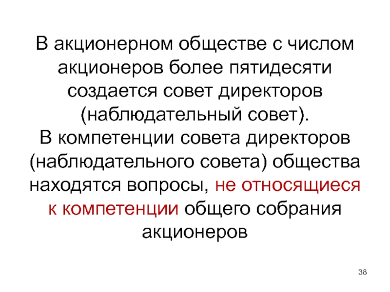 Слайд 38В акционерном обществе с числом акционеров более пятидесяти создается совет директоров