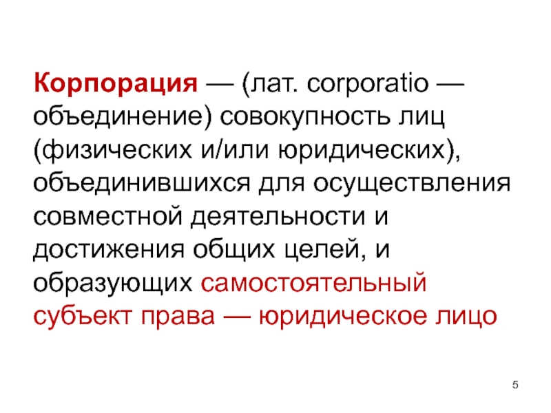 Слайд 5Корпорация — (лат. corporatio — объединение) совокупность лиц (физических и/или юридических),