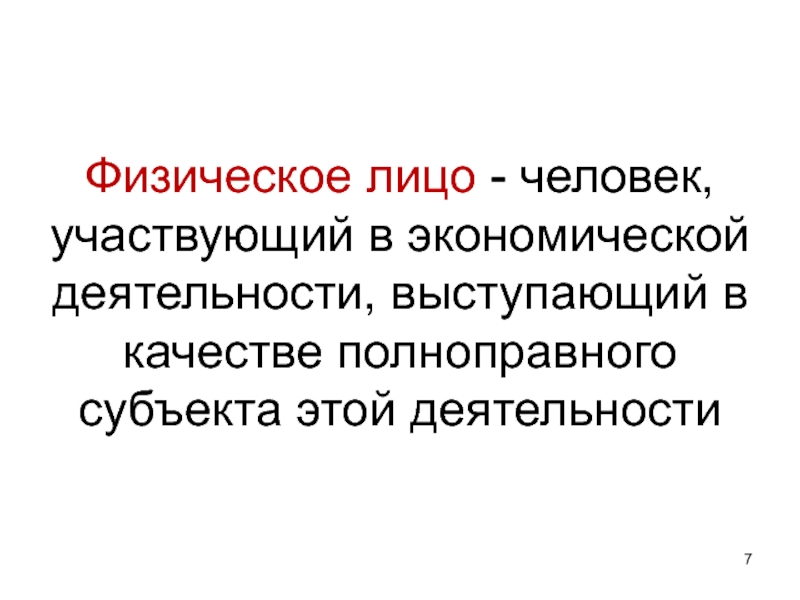Слайд 7Физическое лицо - человек, участвующий в экономической деятельности, выступающий в качестве