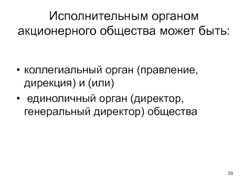 Слайд 39Исполнительным органом акционерного общества может быть: