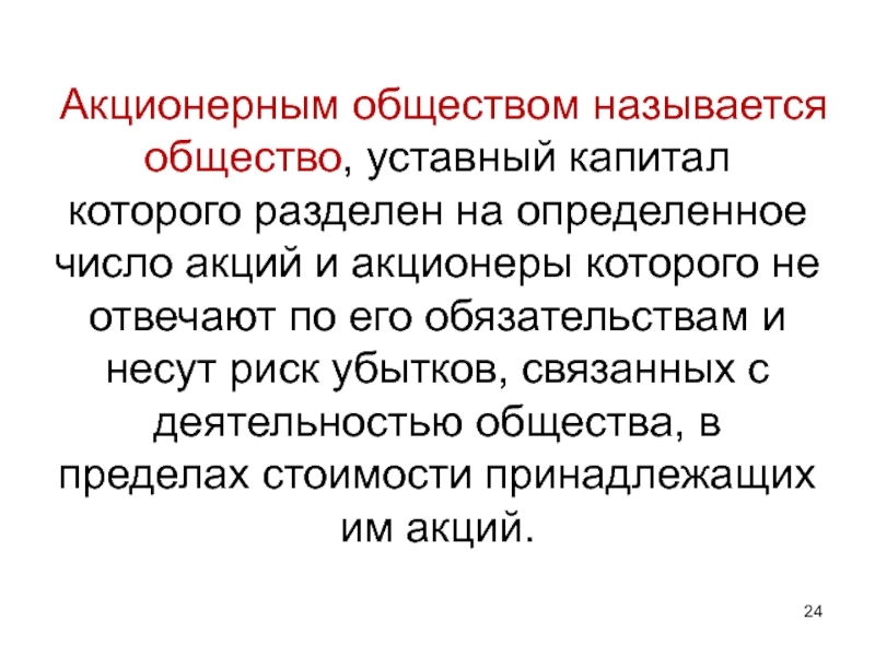 Слайд 24Акционерным обществом называется общество, уставный капитал которого разделен на определенное число