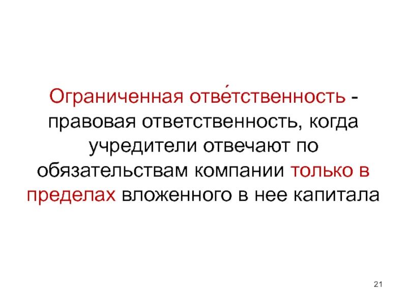 Слайд 21Ограниченная отве́тственность - правовая ответственность, когдa учредители отвечают по обязательствам компании