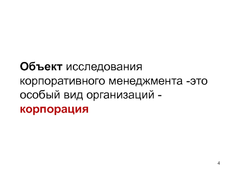 Слайд 4Объект исследования корпоративного менеджмента -это особый вид организаций - корпорация