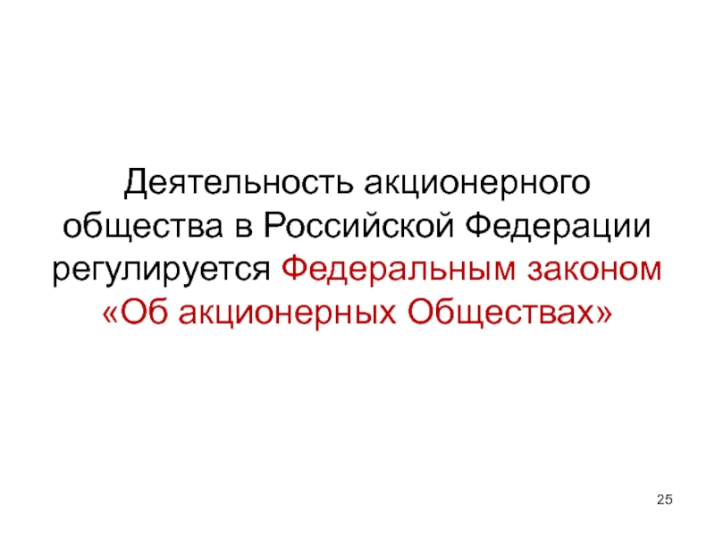 Слайд 25Деятельность акционерного общества в Российской Федерации регулируется Федеральным законом «Об акционерных