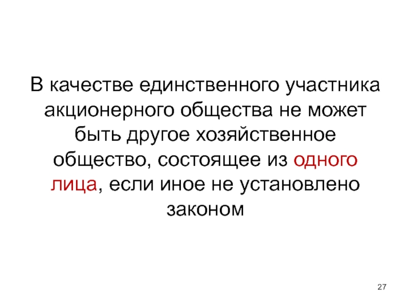 Слайд 27В качестве единственного участника акционерного общества не может быть другое хозяйственное