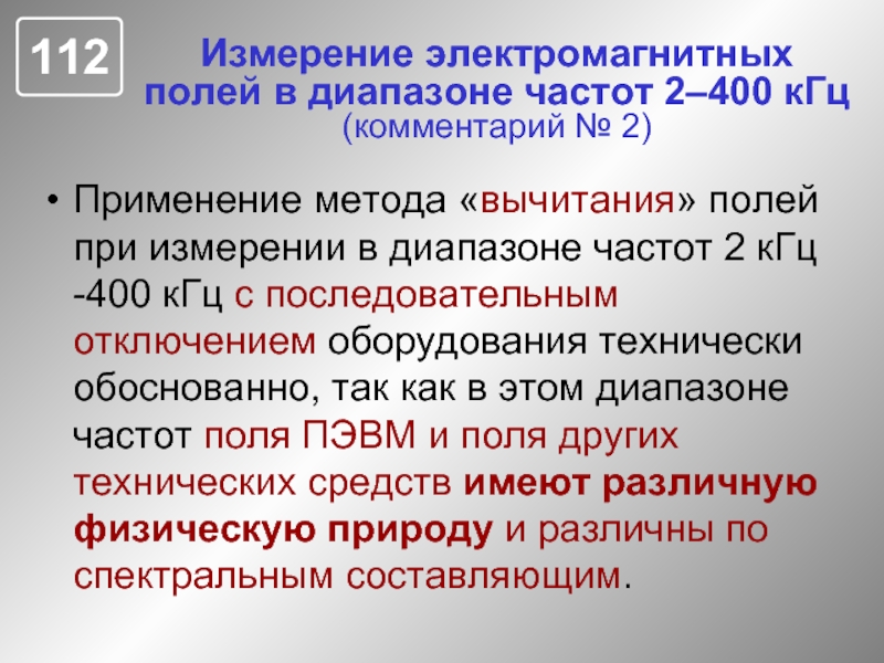 Слайд 112Измерение электромагнитных полей в диапазоне частот 2–400 кГц