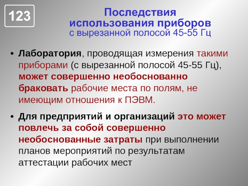 При измерениях приборами с вырезанной полосой 45-55 Гц нормальные ПЭВМ будут необоснованно считаться не годными из за наличия на рабочих местах электромагнитных полей с частотами, отличными от 50 Гц и не имеющим отношения к ПЭВМ.