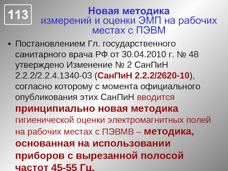 Гл. государственного санитарного врача РФ от 30.04.2010 г. № 48 утверждено Изменение № 2 СанПиН 2.2.2/2.2.4.1340-03 (СанПиН 2.2.2/2620-10), согласно которому с момента официального опубликования этих СанПиН вводится принципиально новая методика гигиенической оценки электромагнитных полей на рабочих местах с ПЭВМВ – методика, основанная на использовании приборов с вырезанной полосой частот 45-55 Гц.