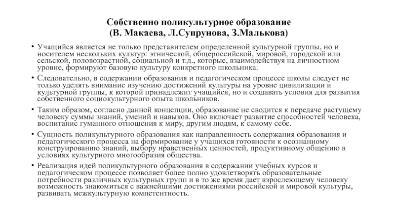 Поликультурное образование — это образование, признающее способность каждого человека выступить отдельным миром культуры, способным к интеграции разных культур (Концепции духовно-нравственного развития и воспитания личности гражданина России (2009) и Концепции развития поликультурного образования в России (2010 Концепция духовно-нравственного развития и воспитания личности гражданина России. )