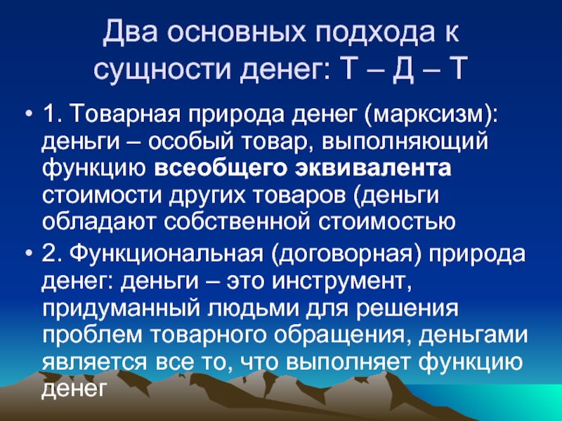 Слайд 4Два основных подхода к сущности денег: Т – Д – Т
