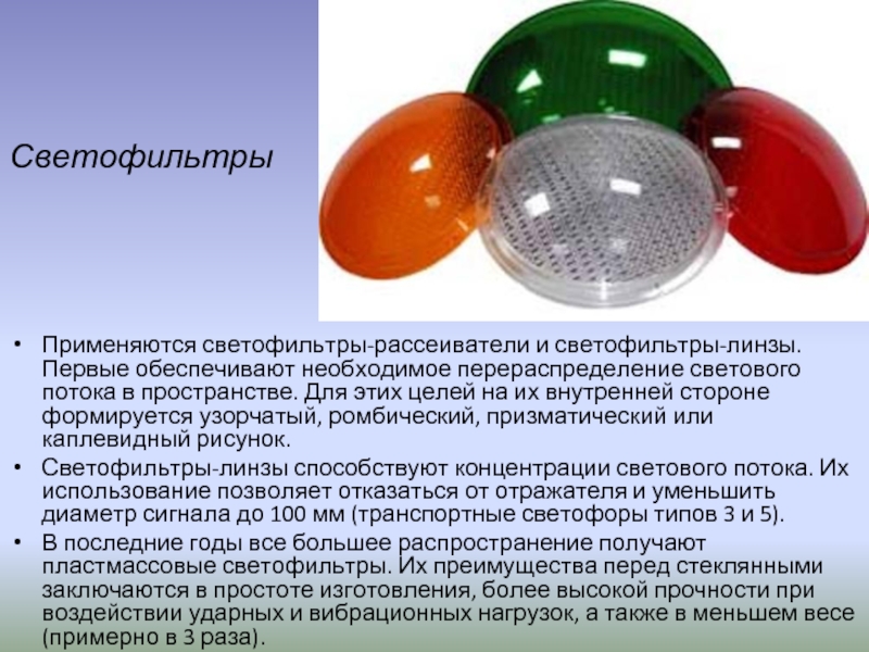 Светофильтры-линзы способствуют концентрации светового потока. Их использование позволяет отказаться от отражателя и уменьшить диаметр сигнала до 100 мм (транспортные светофоры типов 3 и 5).