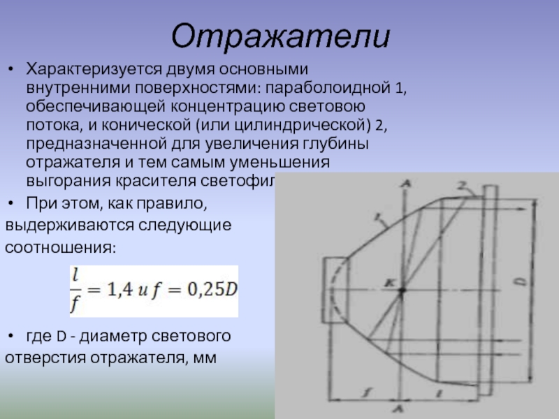Характеризуется двумя основными внутренними поверхностями: параболоидной 1, обеспечивающей концентрацию световою потока,