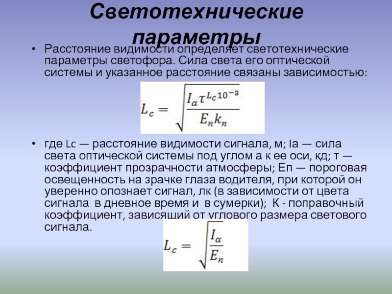 где Lc — расстояние видимости сигнала, м; Iа — сила света оптической системы под углом а к ее оси, кд; т — коэффициент прозрачности атмосферы; Еп — пороговая освещенность на зрачке глаза водителя, при которой он уверенно опознает сигнал, лк (в зависимости от цвета сигнала в дневное время и в сумерки); К - поправочный коэффициент, зависящий от углового размера светового сигнала.