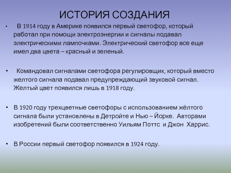 В 1920 году трехцветные светофоры с использованием жёлтого сигнала были установлены в Детройте и Нью – Йорке. Авторами изобретений были соответственно Уильям Поттс и Джон Харрис.