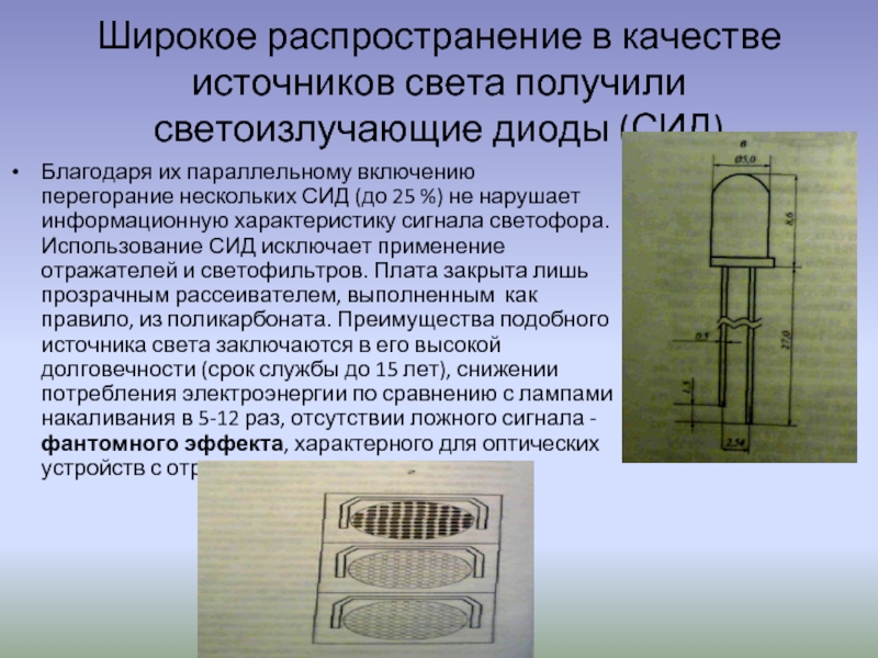 их параллельному включению перегорание нескольких СИД (до 25 %) не нарушает информационную характеристику сигнала светофора. Использование СИД исключает применение отражателей и светофильтров. Плата закрыта лишь прозрачным рассеивателем, выполненным как правило, из поликарбоната. Преимущества подобного источника света заключаются в его высокой долговечности (срок службы до 15 лет), снижении потребления электроэнергии по сравнению с лампами накаливания в 5-12 раз, отсутствии ложного сигнала - фантомного эффекта, характерного для оптических устройств с отражателем.