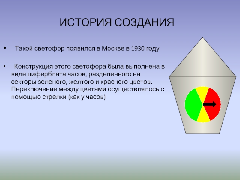 этого светофора была выполнена в виде циферблата часов, разделенного на секторы зеленого, желтого и красного цветов. Переключение между цветами осуществлялось с помощью стрелки (как у часов)