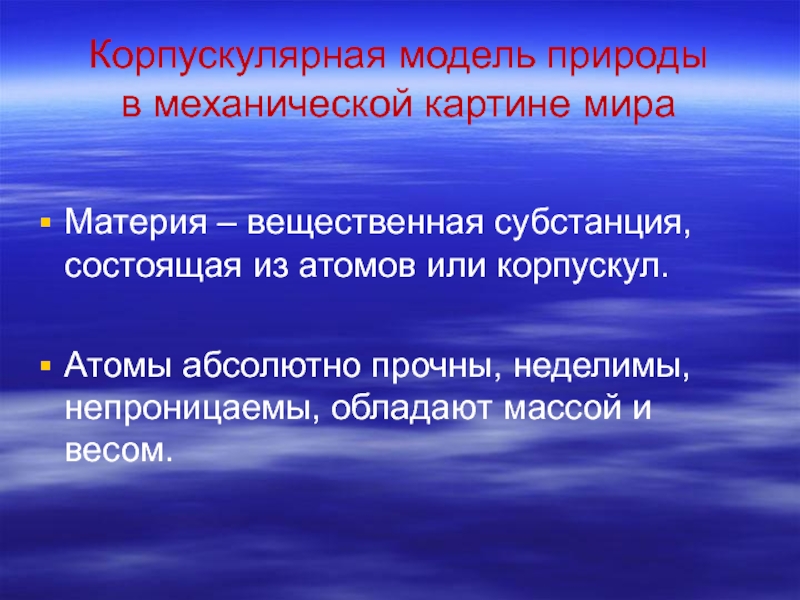 Атомы абсолютно прочны, неделимы, непроницаемы, обладают массой и весом.