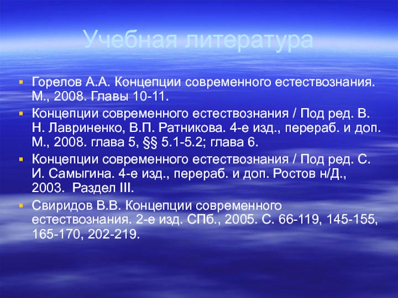 Горелов А.А. Концепции современного естествознания. М., 2008. Главы 10-11.