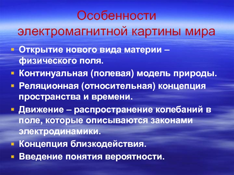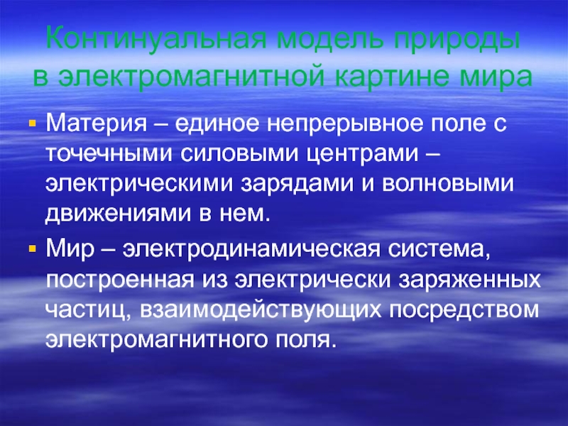 Электромагнитная картина мира (с 3-ей четверти XIX в.) базируется на положениях электродинамики.