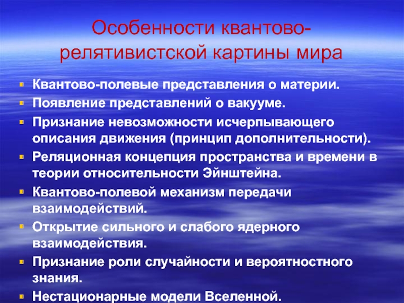 Квантово-релятивистская картина мира (с начала XX в.) опирается на квантовую механику и теорию относительности.