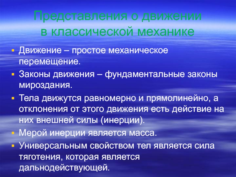 Тела движутся равномерно и прямолинейно, а отклонения от этого движения есть действие на них внешней силы (инерции).