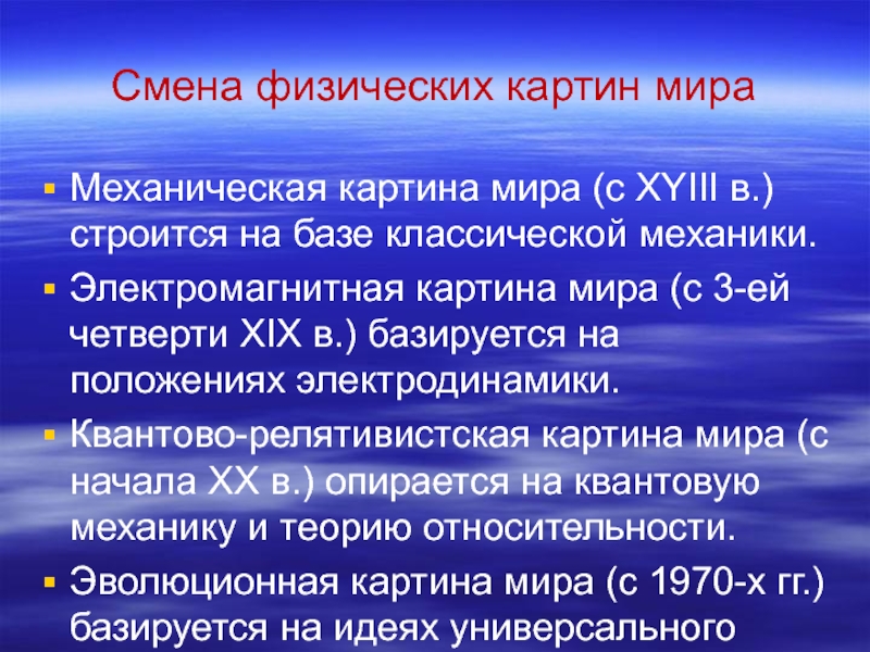 Эволюционная картина мира (с 1970-х гг.) базируется на идеях универсального эволюционизма и синергетики.