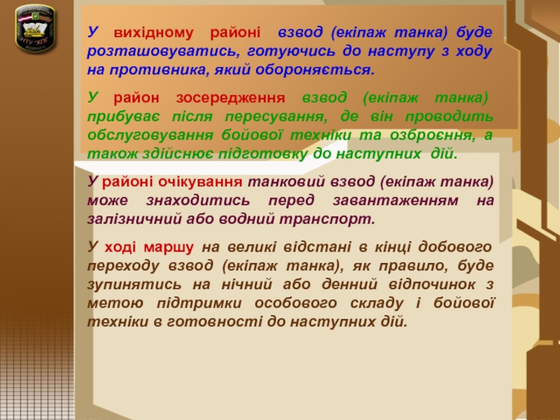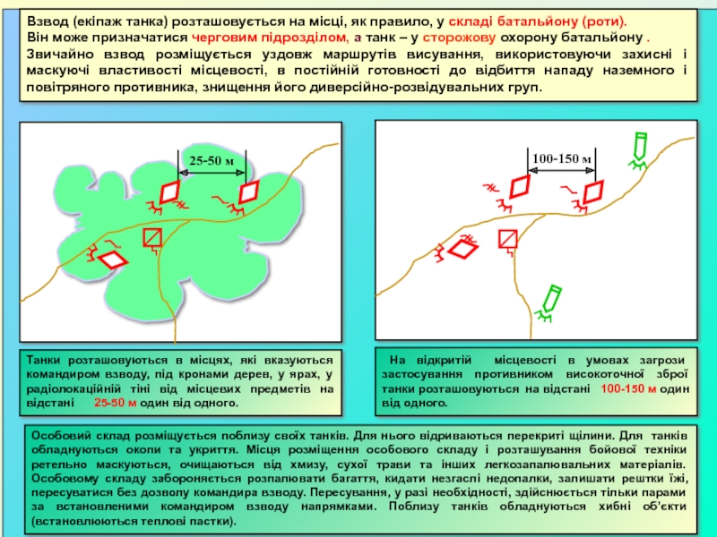 Особовий склад розміщується поблизу своїх танків. Для нього відриваються перекриті щілини. Для танків обладнуються окопи та укриття. Місця розміщення особового складу і розташування бойової техніки ретельно маскуються, очищаються від хмизу, сухої трави та інших легкозапалювальних матеріалів. Особовому складу забороняється розпалювати багаття, кидати незгаслі недопалки, залишати рештки їжі, пересуватися без дозволу командира взводу. Пересування, у разі необхідності, здійснюється тільки парами за встановленими командиром взводу напрямками. Поблизу танків обладнуються хибні об’єкти (встановлюються теплові пастки).