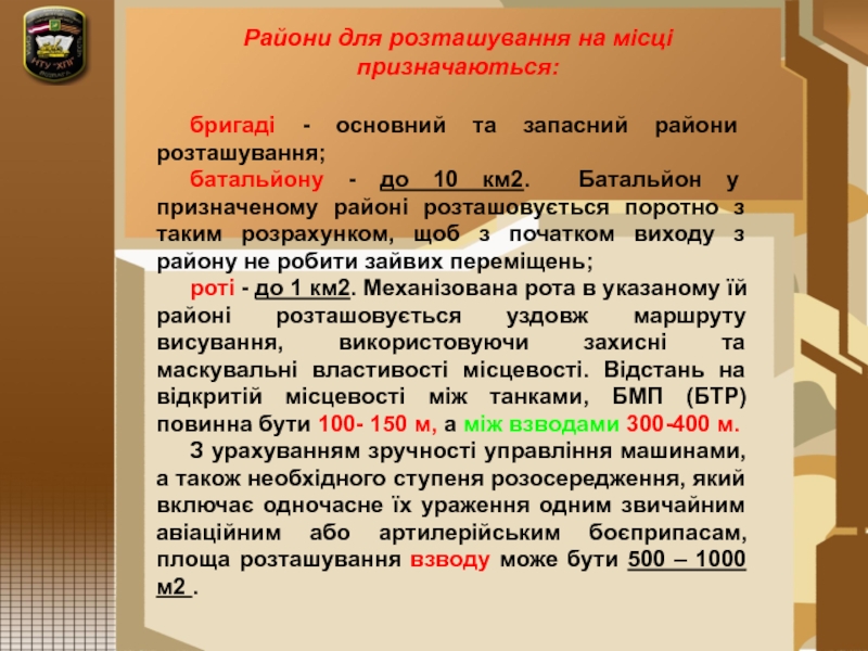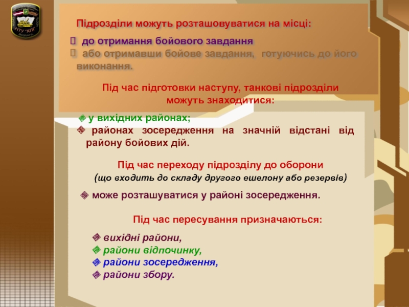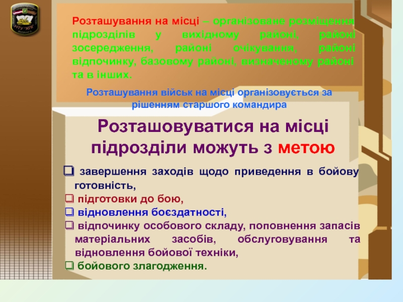 Розташування на місці – організоване розміщення підрозділів у вихідному районі, районі зосередження, районі очікування, районі відпочинку, базовому районі, визначеному районі та в інших.