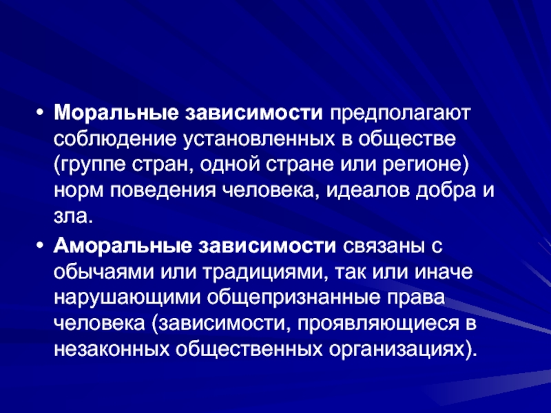 Слайд 6Моральные зависимости предполагают соблюдение установленных в обществе (группе стран, одной стране
